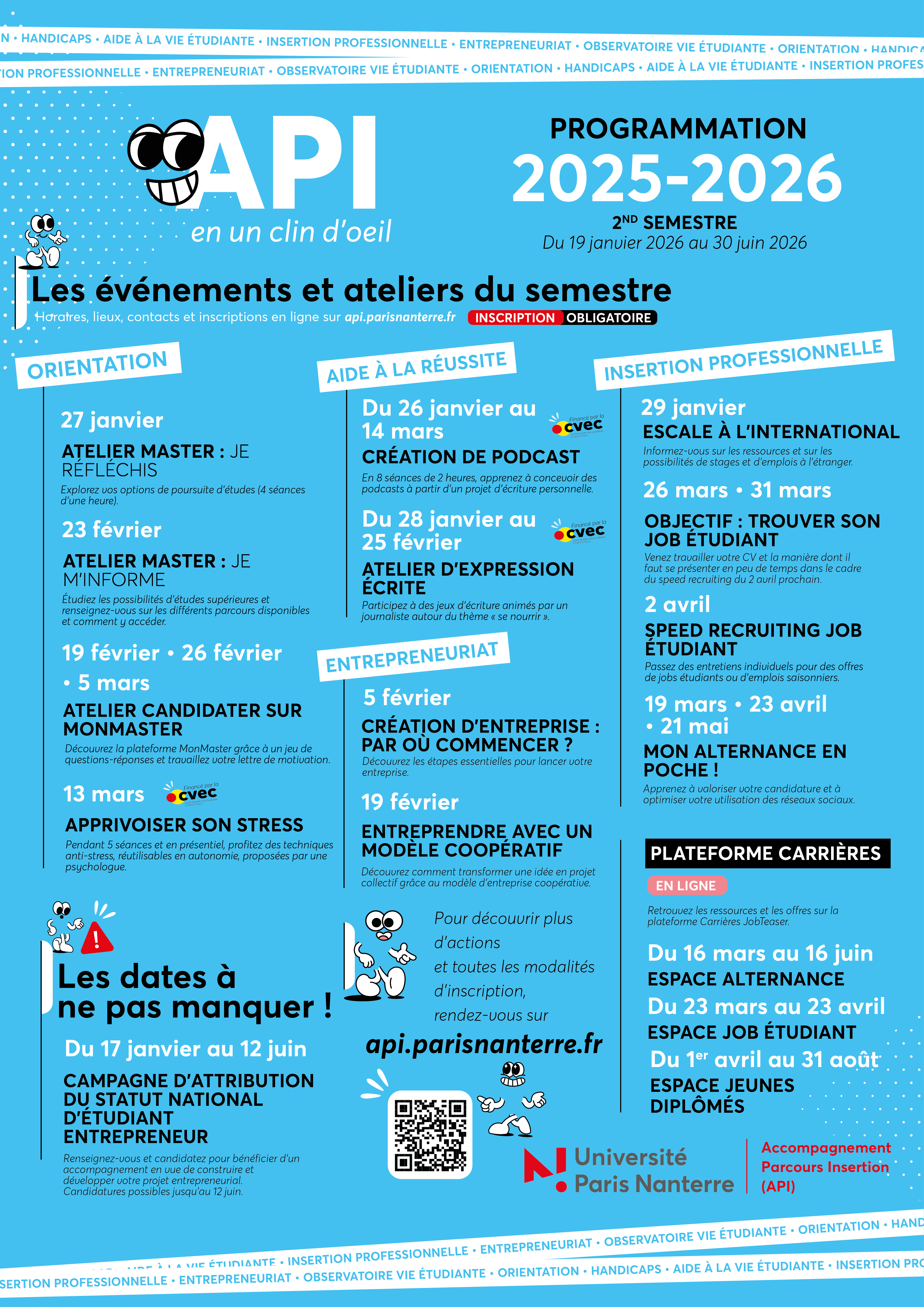 Le service commun Accompagnement Parcours Insertion (API), vous accompagne tout au long de votre cursus universitaire, pour les questions relatives à l’orientation et l’aide à la réussite, le handicap et l’accessibilité, l’insertion professionnelle et la sensibilisation à l’entrepreneuriat.
